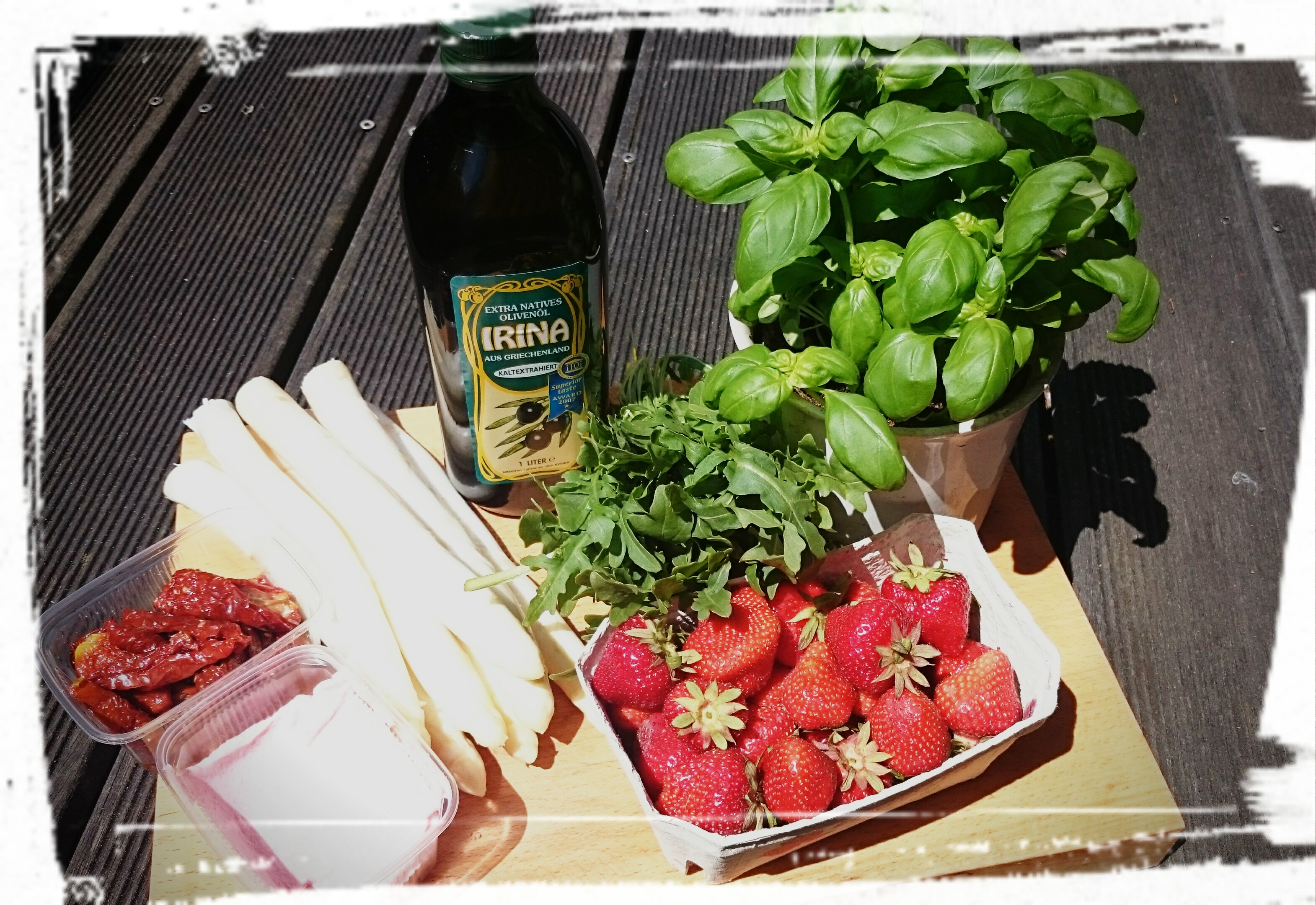 Am liebsten besuche ich aber den Käsestand, hier finde ich immer wieder neue Sorten zum Testen! Wurst, Fleisch, Fisch und Blumen gibt’s natürlich auch! In meinen Einkaufskorb haben es heute Spargel aus der Pfalz, Rucola, Basilikum, Erdbeeren, Olivenöl, eingelegte Tomaten und Taramas (griechische Fischrogenpaste) geschafft.