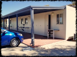 In den Merredin Tourist Park kann man mit seinem eigenen Camper kommen. Man kann aber auch Unterkünfte verschiedener Preis- und Standard-Kategorien mieten. Ich hab mich für die günstigste Variante entschieden – und bin in einem witzigen & winzigen Blech-Reihen-Hüttchen (siehe oben, links) gelandet. Mein Auto konnte ich direkt vor meiner Tür parken. Und vor dieser Tür musste ich auch essen, denn für einen Tisch hat es drinnen nicht gereicht: Bett, Schrank, Kühlschrank, TV und Bad. Fertig. Meine Nachbarn waren Wanderbauarbeiter, für die diese Art der Unterkunft wahrscheinlich gedacht ist… Wir beäugten uns vorsichtig. Ich bin sicher, dass die Jungs mich genau so eigenartig fanden wie ich sie! Gut verstanden haben wir uns trotzdem, auch wenn ich mal vorsichtshalber eine SMS mit meinem Standort und den Plänen für die nächsten zwei Tage an meine Freundin Simone im über 400 km entfernten Denmark abgesetzt habe. Sicher ist sicher!