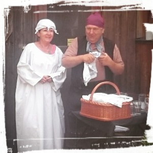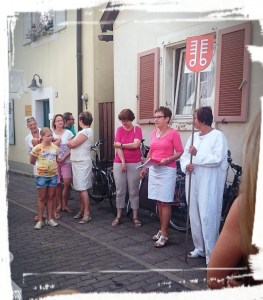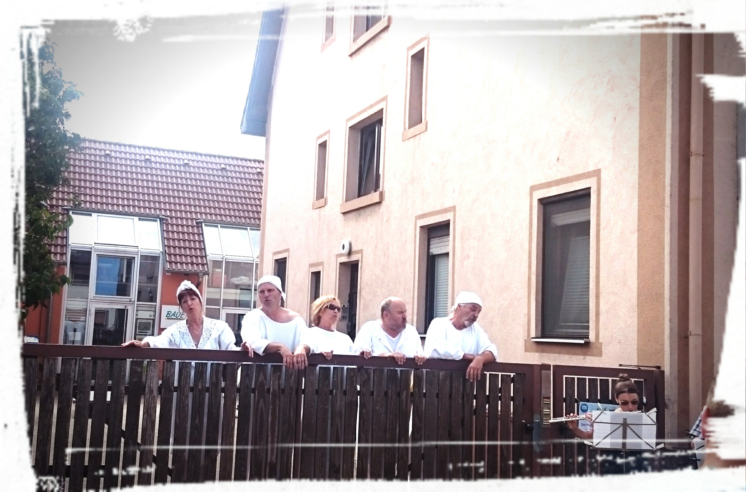Eine der weiteren Stationen war ein hübscher Hinterhof. Hier war eine Gastwirtschaft aufgebaut, in der das Bier reichlich floss, junge Männer um die Gunst der Frauen stritten und auch Politik gemacht wurde. Man sieht, seit 1103 hat sich gar nicht so viel verändert! Sich das Theater-Stück ausgedacht und inszeniert hat Friedemann A. Nawroth. Mit von der Partie waren Schüler, Mitglieder verschiedener Vereine und Musiker aus Rüppurr. Ein riesiger Aufwand, der eine tolle zweistündige Show hervorgebracht hat!