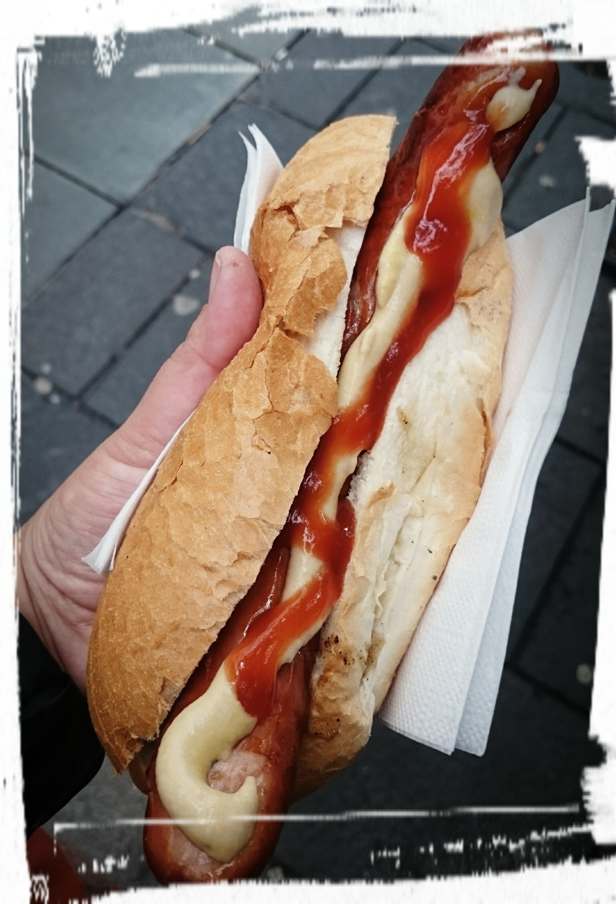 In Glasgow gibt es so viele Restaurants, dass man sich kaum entscheiden kann! Während meiner Shopping-Tour am letzten Urlaubstag habe ich aber die schnelle Street-Food-Variante gewählt. In der Sauchiehall Street gibt es eine Art Markt. Hier kann man Blumen kaufen oder Süßes. Und eben essen – von der Asia-Pfanne bis zur deutschen Bratwurst. Ich habe mich für einen scharfen Hotdog mit Zwiebeln, Senf und Ketchup entschieden.