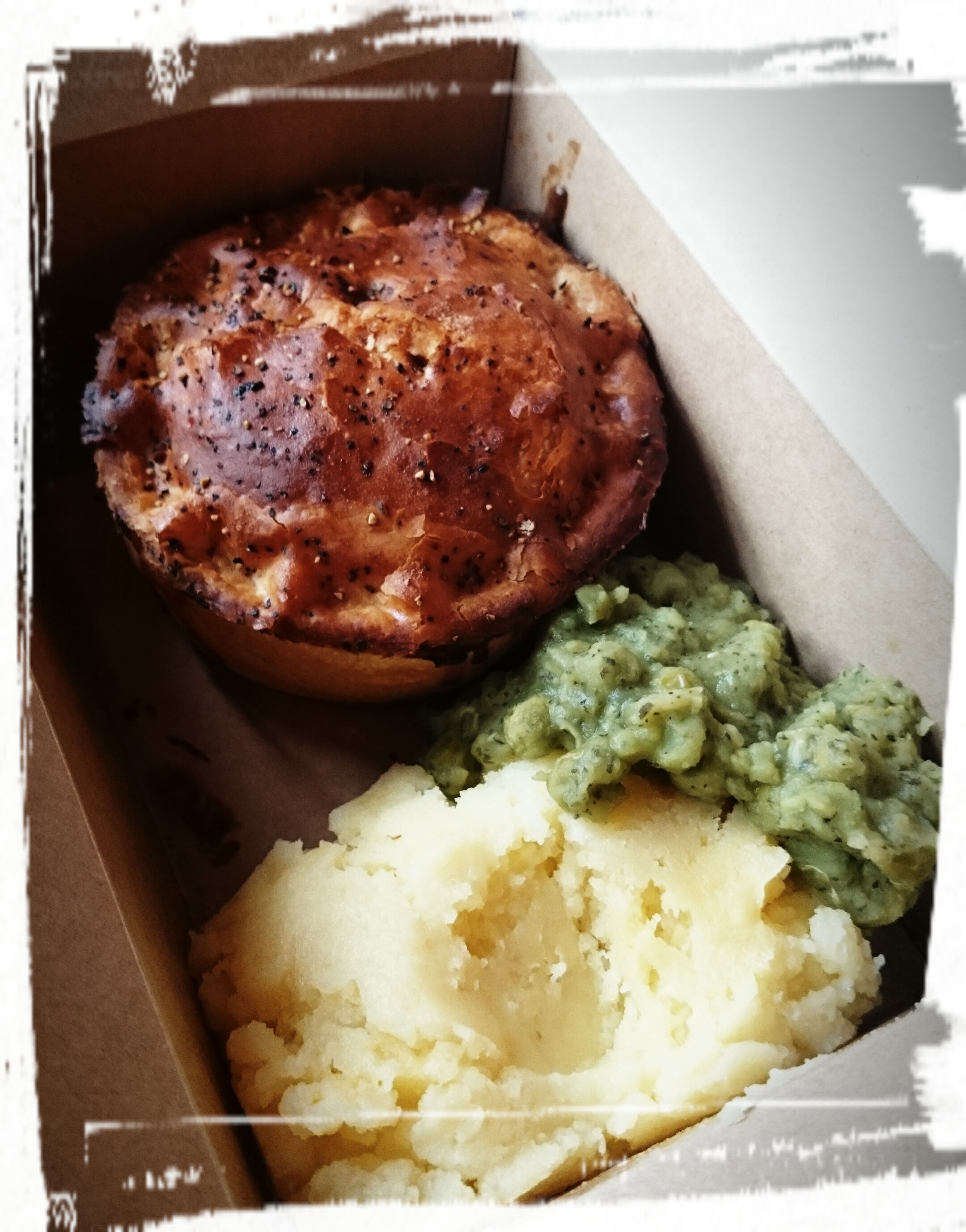 Ich schwelge noch ein bisschen im Urlaubs-Leckereien-Himmel. Im BrewDog in Dundee gibt es nicht nur viel Bier, sondern auch leckeres Bar-Food. Ich hatte eine Pastete mit Rindfleisch und Gemüse drin. Aber Achtung, die Dinger sind sehr lange sehr heiß, da verbrennt man sich leicht die Zunge! Dazu gab es Kartoffelbrei, Erbspüree und braune Soße. Alles serviert in einem Pappkästchen. Echt, im Karton! Vor allem die Erbsen fand ich lecker. Die mag ich normal gar nicht so sehr. Aber als stückiges Püree fand ich sie sehr charmant.