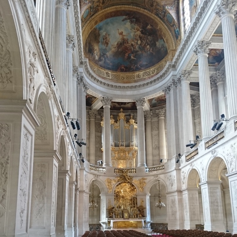 Ludwig XIV. war also eher ein Arbeitstier. Darum gibt es auch mehrere Bibliotheken im Schloss. An eine schließt sich ein winzig kleiner Raum an. Wozu der wohl war? Hier hat sich der Sonnenkönig seinen Kaffee gekocht. Wirklich. Ganz selbst. Und endlich mal nicht von einem Haufen Dienern umgeben. Auf dem Foto links sieht man die Kapelle des Schlosses. Oder besser die 5. Kapelle, die 1710 erbaut wurde. Hier heirateten 1770 Ludwig XVI. und Marie Antoinette. Nachdem die junge Braut zuvor schon eine „Trauung per Stellvertreter“ in Wien und eine lange Reise über Straßburg (hier musste sie alles Österreichische hinter sich lassen) nach Versailles hinter sich gebracht hatte. Die Decke der Kapelle ist wirklich traumhaft schön ausgemalt! Und ich durfte sogar richtig hinein, auf einem der samtigen Stühle sitzen und die besondere Atmosphäre genießen.