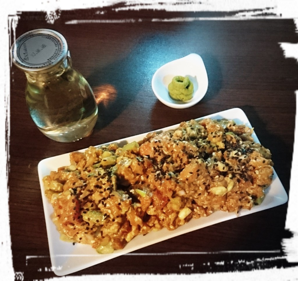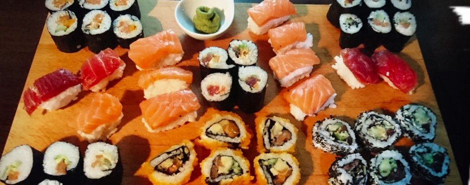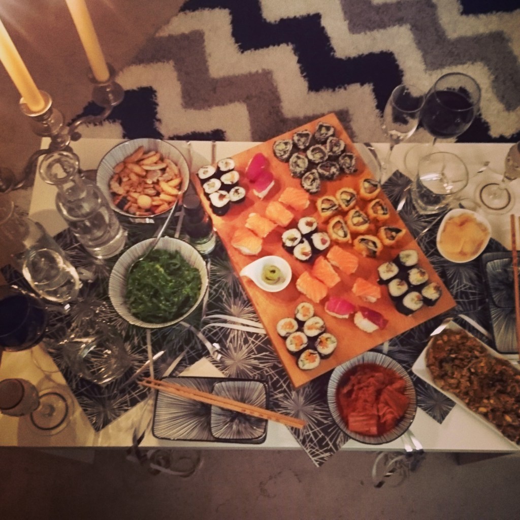 Und nun zum Fisch: Vorab habe ich im Netz gelesen, dass man für zwei Personen mit ca. 300 g Fisch kalkulieren soll. Das fand ich zu wenig! Also haben ich 500 g frischen Fisch in Sushiqualität beim Fischhändler bestellt & gekauft. Was ihr auf dem Foto (unten rechts) seht, ist der „Rest“ von Lachs und Thunfisch – nachdem wir Rollen und Nigiri fertig gebaut haben… Vielleicht hätte noch ein bisschen mehr Fisch in den einzelnen Rollen Platz gehabt. Aber 300 g Fisch wären definitiv genug gewesen ;-) Da aber nix verschwendet wird, zaubere ich eine Art Sushi-Circle-Lachssalat (den esse ich dort immer). Hierfür den Fisch würfeln mit Gurke, Avocado, Frischkäse, Sojasoße, Salz, Pfeffer, Chilli & Sesam abschmecken und genießen. Das Rezept ist nicht ganz wie’s Original. Aber mit den vorhandenen Zutaten ist er doch ganz hervorragend geworden. Mit aufs Bild schmuggelt sich leckerer Reiswein.