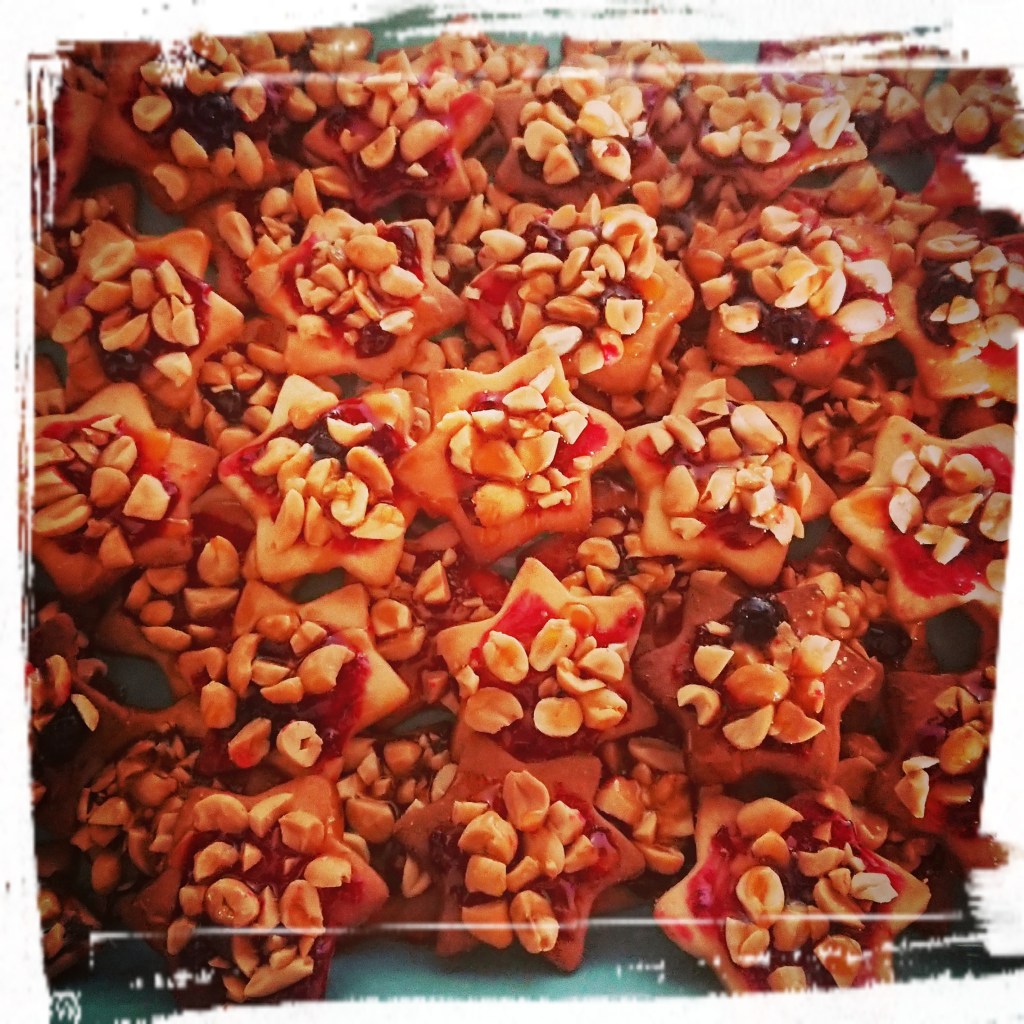 - Den Ofen auf 175 Grad vorheizen. Die Sterne aufs Backblech legen und ca. zehn Minuten backen. Anschließend auskühlen lassen. Die Marmelade im Topf etwas erwärmen, auf die Plätzchen streichen. Erdnüsse darauf verteilen.