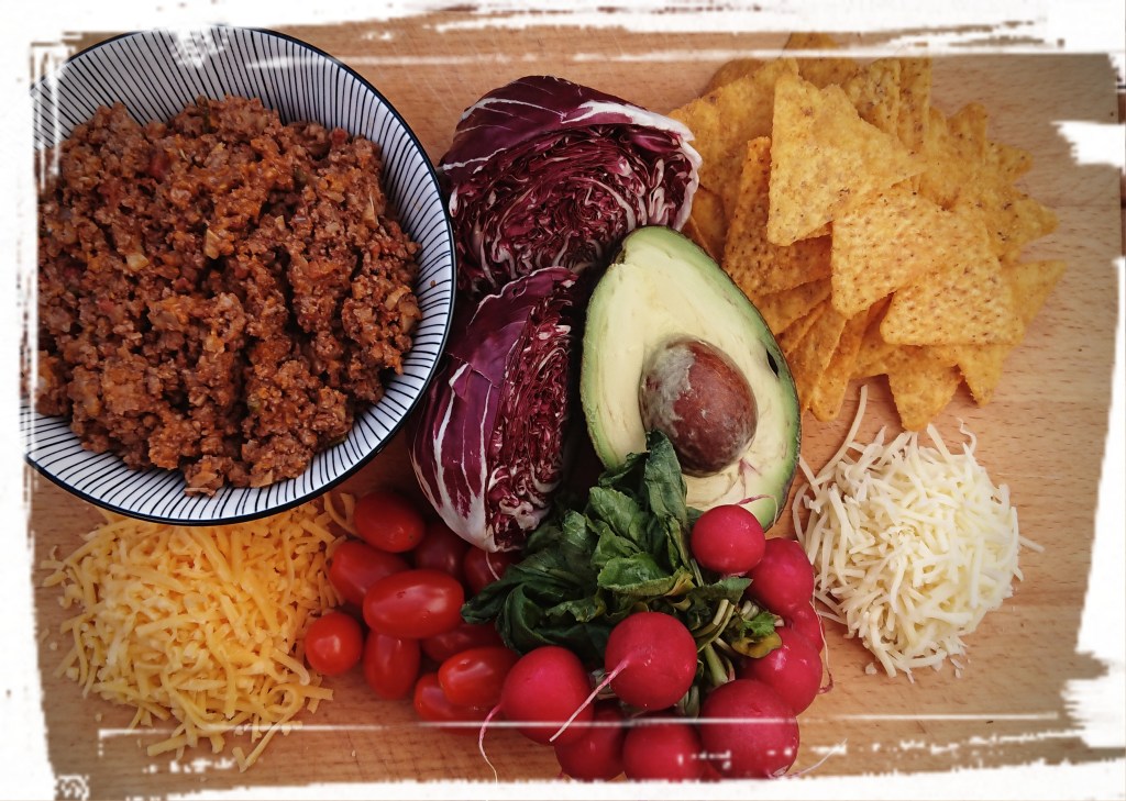 - Heizt den Ofen auf 200 Grad vor. Legt ein Backpapier auf ein Blech oder in eine Auflaufform. Dann eine Lage Nachos darauf verteilen. Die Hälfte der Bolognese darüber. Mit Salat, Avocado, Frühlingszwiebel, Tomate und Cheddar bestreuen. Dann wieder Nachos, Bolognese, Gemüse und Käse… Zum Abschluss eine weitere Lage Nachos darauf verteilen und mit dem Bergkäse – der noch ein bisschen mehr Würze bringt – bestreuen.