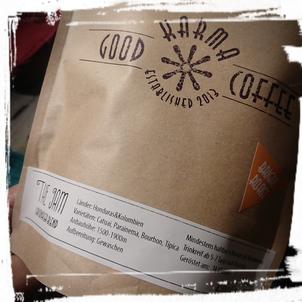 Man steckt die einzelnen Teile ineinander, legt den Permanent-Filter ein. Dann kommt eher grob gemahlenes Kaffeepulver drauf. Ich habe mich in der Perlbohne, ihr wisst schon, beraten lassen. Und weiß jetzt, dass ich am besten einen Bright Roast benutzen soll. Dann wird die ganze Sache weniger bitter bzw. sauer. Aktuell bieten sie dafür u.a. den The Jam von Good Karma Kaffee in Karlsruhe an. Bright Roasts sind eher fruchtig, haben keine Bitterstoffe und sind von Natur aus süßer als andere Röstungen.